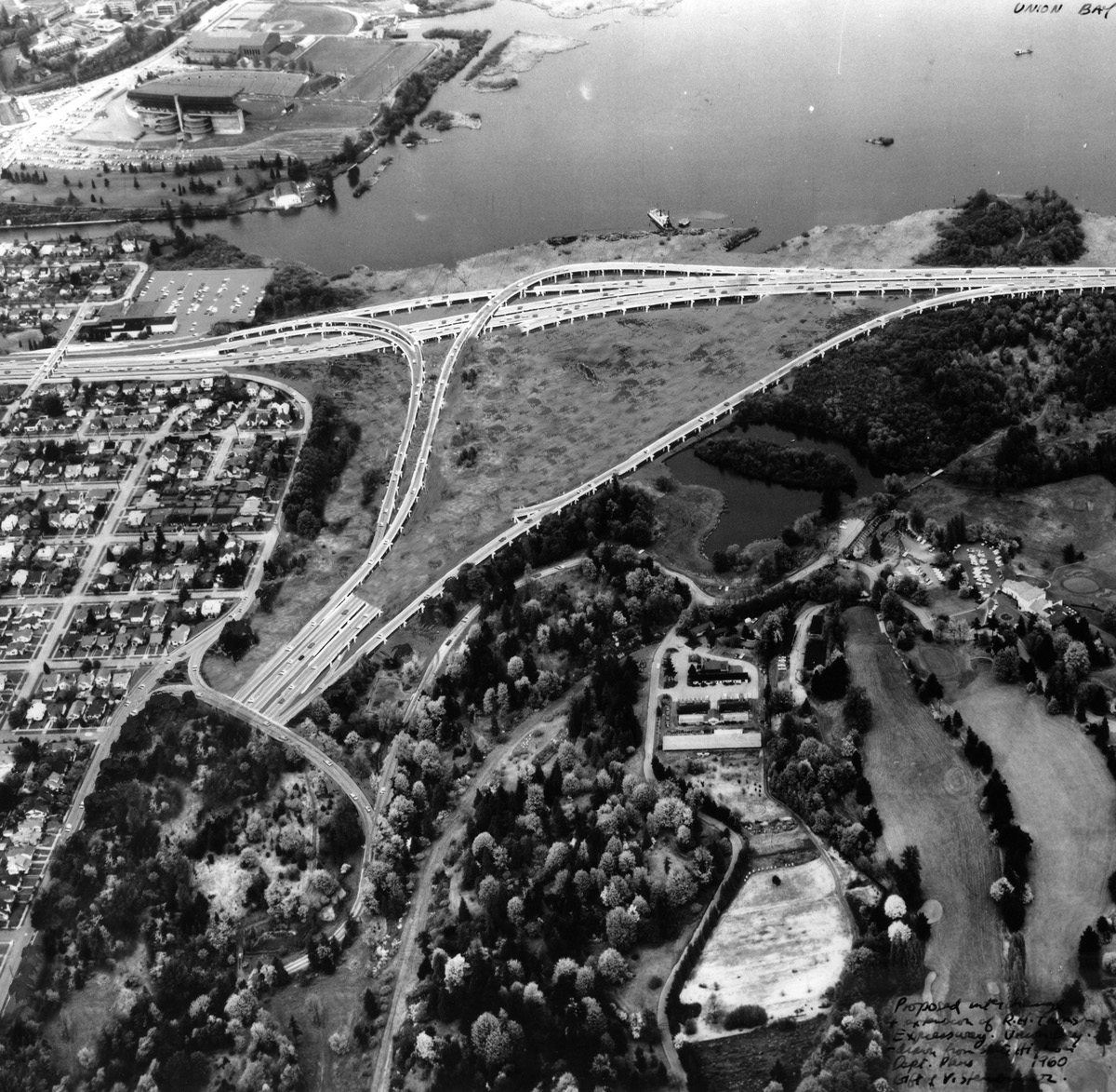 Aerial view of what was built in 1963 and what exists today. Husky Stadium and the Montlake Cut are in the upper left, Foster Island is in the upper right. The Arboretum is in the lower left and the Broadmoor Golf Course is lower right.