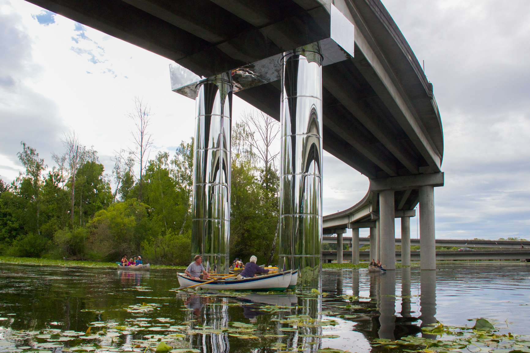 The Gate to Nowhere is by Re-Collective, a group of architects, artists and designers interested in the tenuous existence of soon-to-be-demolished structures. The installation wraps a single support pier — two concrete columns and a beam — in mirrored acrylic. The effect renders the pier in reflections of water, sky, lily pads and light.